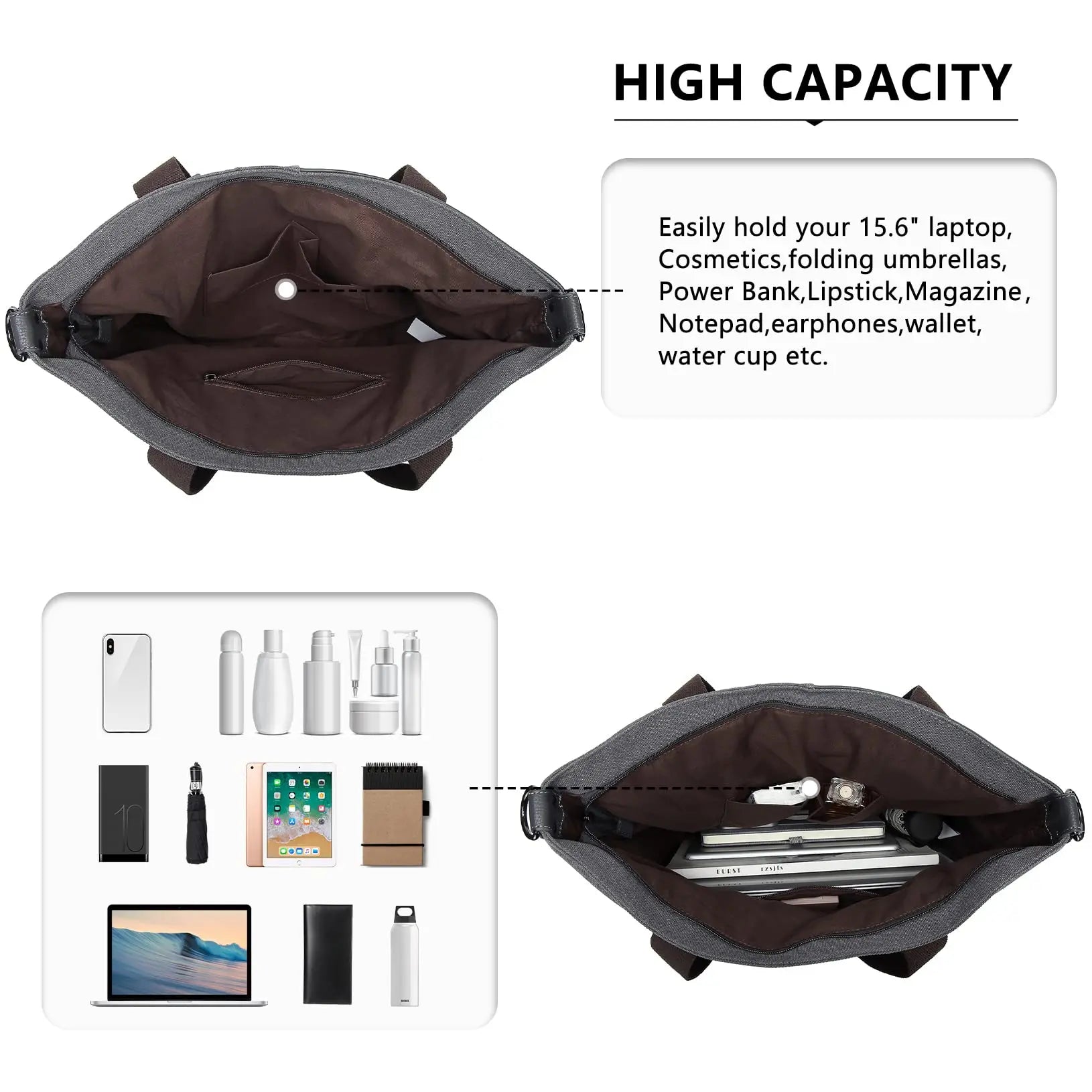 Large enough to hold a 15.6 inch laptop, folders, A4 books, umbrella, water bottle, clothes, phone, power bank, ect.